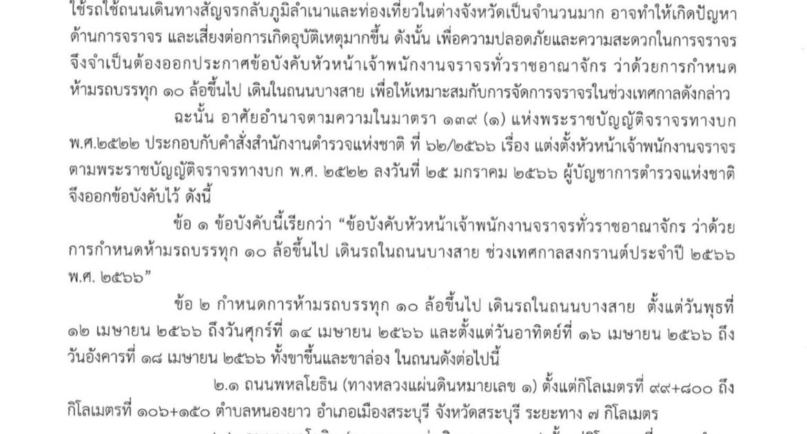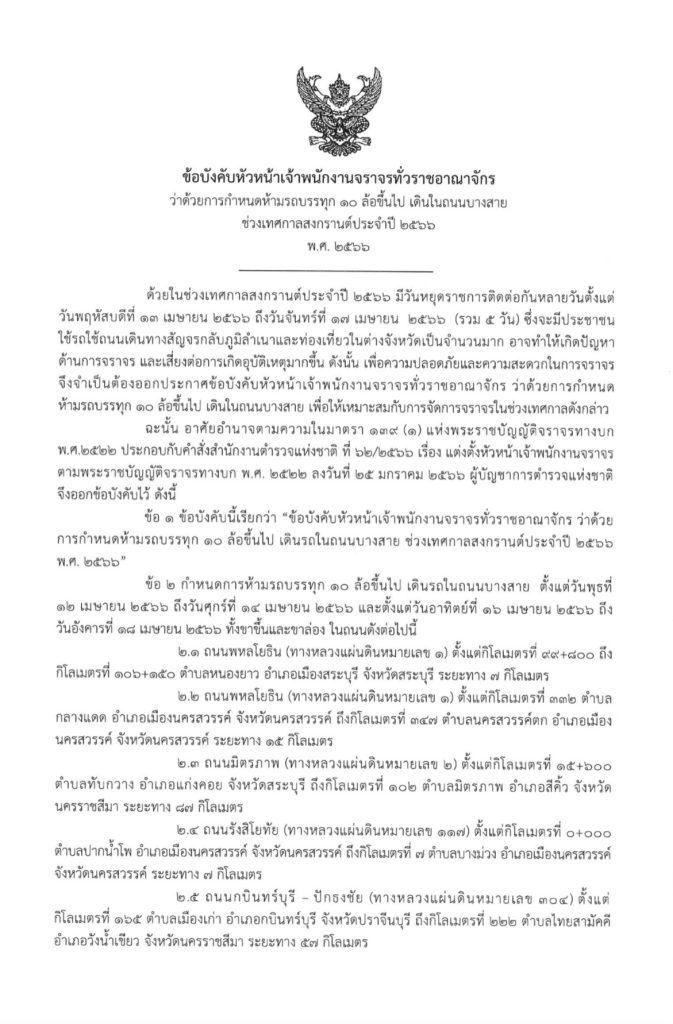 ข้อบังคับหัวหน้าพนักงานจราจรทั่วราชอาณาจักร ว่าด้วยการกำหนดห้ามรถบรรทุก 10 ล้อขึ้นไป เดินในถนนบางสาย ช่วงเทศกาลสงกรานต์ประจำปี 2566 31 มีนาคม 2566 โดย admin / ข่าวประชาสัมพันธ์