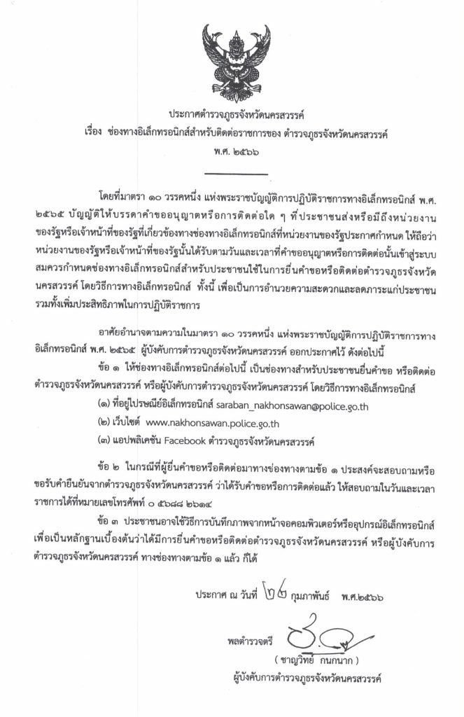 ช่องทางอิเล็กทรอนิกส์สำหรับติดต่อราชการของ ตำรวจภูธรจังหวัดนครสวรรค์