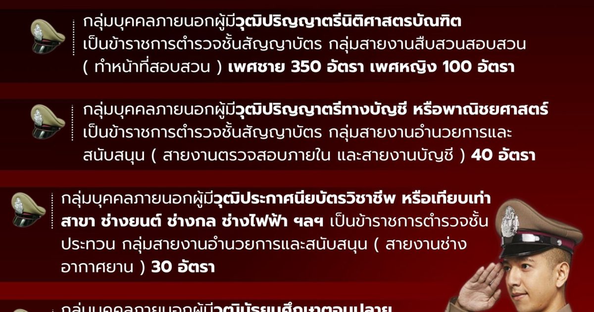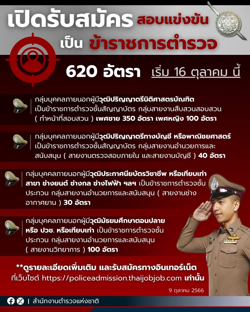 สำนักงานตำรวจแห่งชาติ โดย #กองการสอบ กองบัญชาการศึกษา เปิดรับสมัครบุคคลภายนอก สอบแข่งขัน เพื่อสอบบรรจุแต่งตั้งเป็นข้าราชการตำรวจชั้นสัญญาบัตร และชั้นประทวน สายงานต่าง ๆ รวม 620 อัตรา 📍สามารถตรวจสอบรายละเอียดเพิ่มเติม และสมัครทางอินเทอร์เน็ต ที่ https://policeadmission.thaijobjob.com เท่านั้น