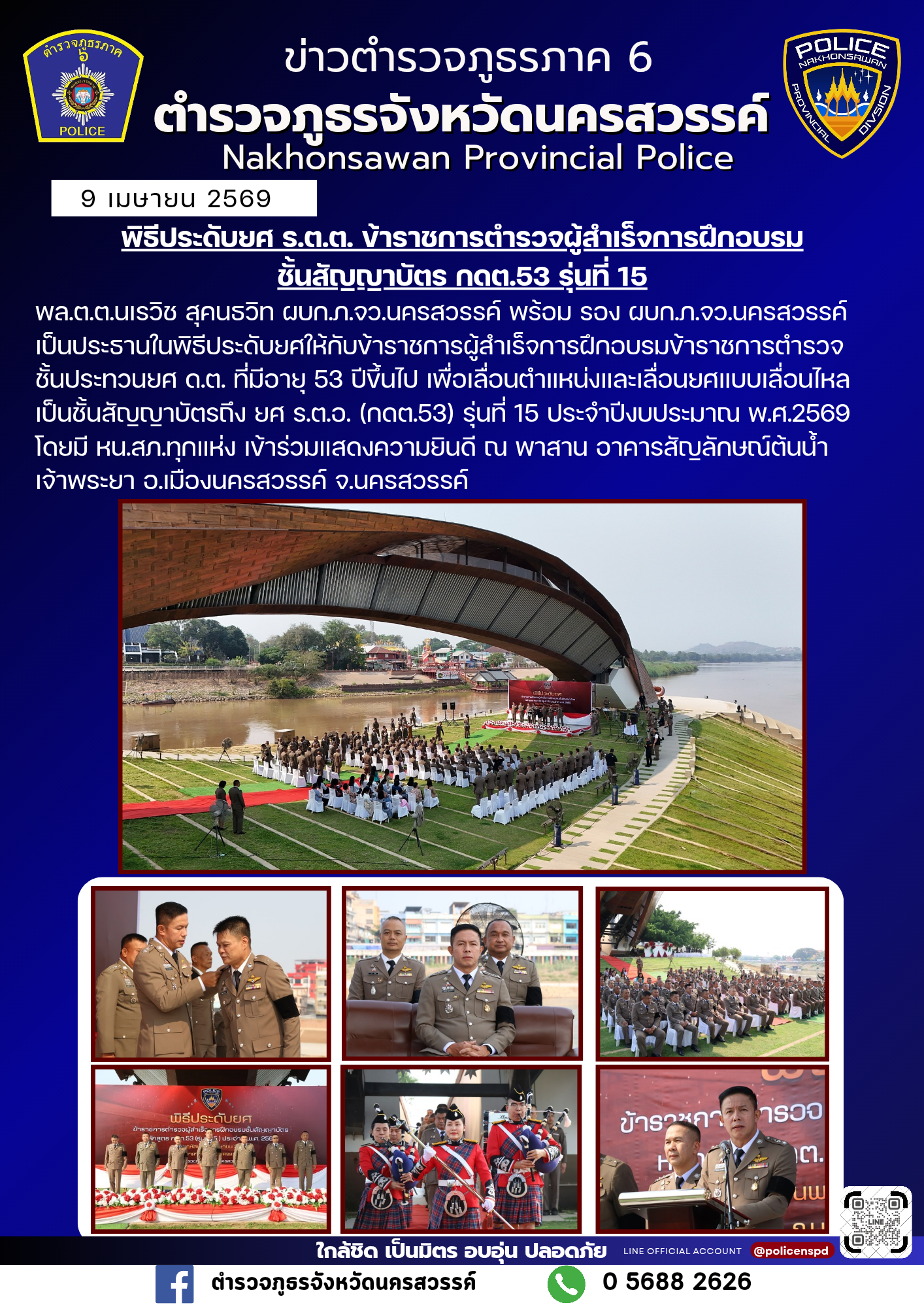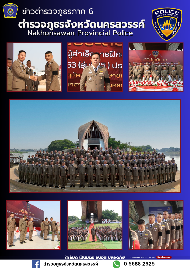 พล.ต.ต.นเรวิช สุคนธวิท ผบก.ภ.จว.นครสวรรค์ พร้อม รอง ผบก.ภ.จว.นครสวรรค์ เป็นประธานในพิธีประดับยศ ร.ต.ต. ข้าราชการตำรวจผู้สำเร็จการฝึกอบรบรม ชั้นสัญญาบัตร กดต.53 รุ่นที่ 15